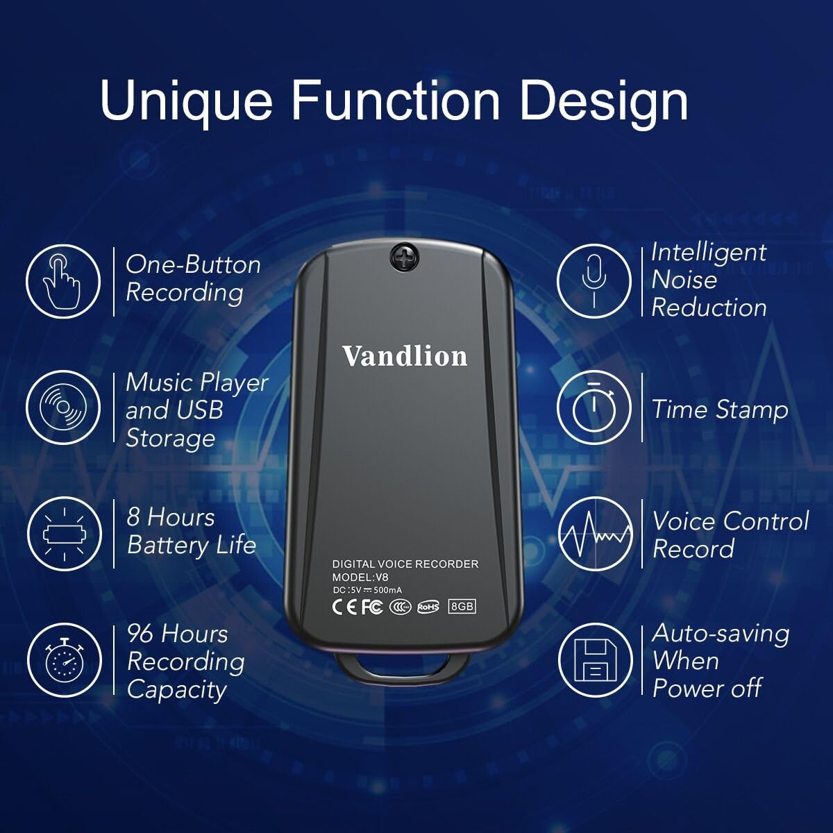 Image 1: Vandlion V8 Keychain Voice Recorder highlighting features like one-button recording, intelligent noise reduction, time stamp, voice control record, auto-saving, music player, USB storage, 8 hours battery life, and 96 hours recording capacity.