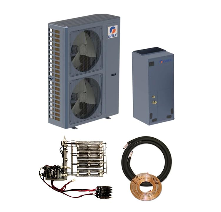The Gree Flexx system includes an indoor unit (FLEXX48HP230V1AH) and an outdoor unit (FLEXX60HP230V1AO), along with a 25-foot line set and a heater kit. Its horizontal discharge design contributes to a smaller, quieter footprint and up to 20 SEER efficiency.